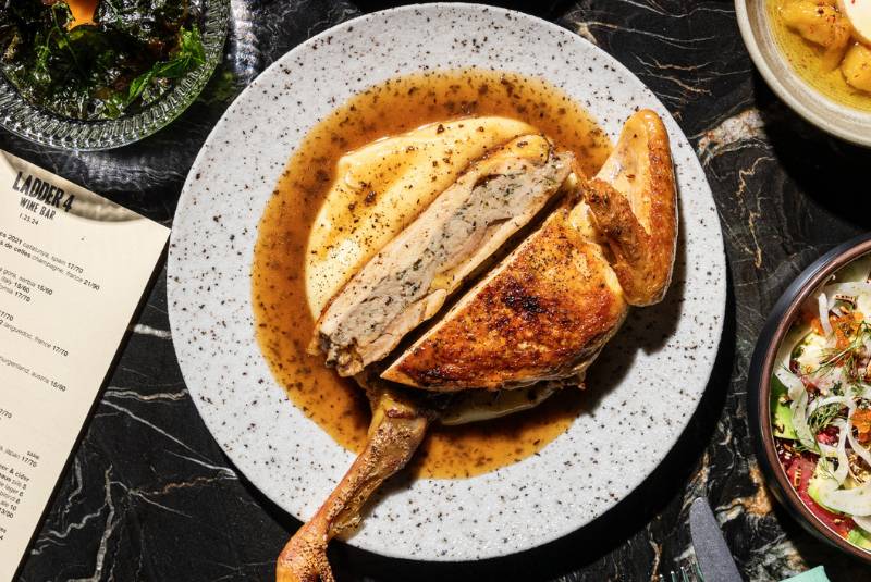 Ladder 4's menu modus operandi is brilliant produce, like this golden chicken stuffed with Toulouse sausage, served with zero pretension