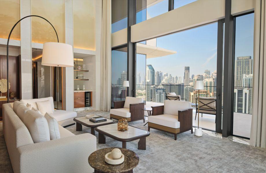 In a city known for its gilded excess, The Lana offers a quieter sort of grandeur. Opened in 2024 as the Dorchester Collection’s Middle Eastern debut, the hotel anchors the sparkling Marasi Bay Marina, trading bling for serenity. Forget ostentation: The Lana feels like an exclusive collection of private residences, loved by savvy business travellers and in-the-know locals. Its signature claret hue is woven through design accents, from the bellmen’s dapper uniforms to the rose-tinted interior palette. In the lobby, a three-metre floral masterpiece by Philip Hammond sets the tone. Rooms look out over either Dubai’s golden suburbs or the gleaming Marina and Downtown skyline, offering front-row views of the Burj Khalifa. Inside, blush and rose quartz features mingle with marble, walnut and tactile velvet. Every detail, from Dyson hairdryers to Buckingham Palace-approved mattresses, whispers Dorchester-calibre luxury. The dining is no less knock out. Riviera by Jean Imbert serves French elegance with a rooftop twist, while Jara by Martín Berasategui delivers Basque brilliance in a scarlet-washed setting. High Society offers next-level skyline views, and afternoon tea in the pink-and-white lobby is a confectionary triumph. For a breather, head to the rooftop pool or the sought-after Dior Spa.